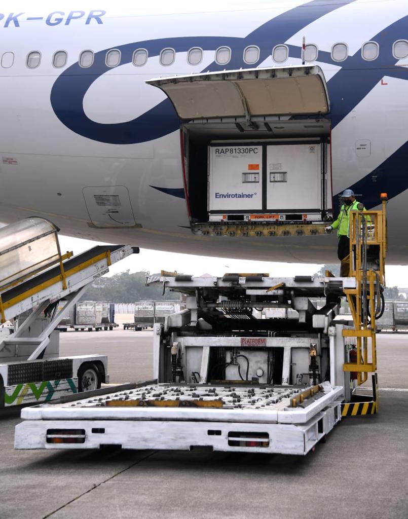 VAKSIN – Lagi, 10 juta dosis vaksin tiba di Indonesia, Minggu (20/6/2021). Vaksin dibawa dengan menggunakan pesawat Garuda.