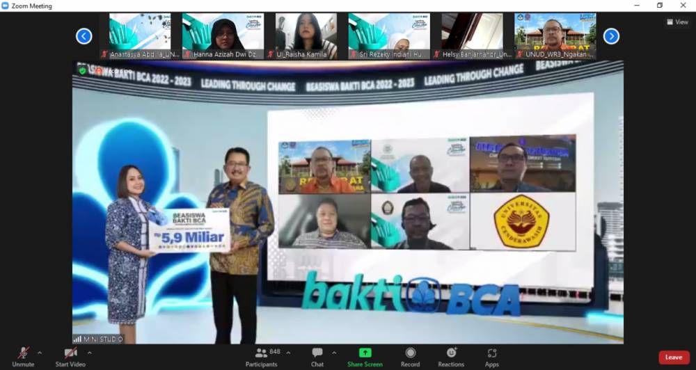 Wakil Rektor Bidang Kemahasiswaan Universitas Udayana Prof. Ngakan Putu Gede Suardana menghadiri undangan Opening Program Nasional Beasiswa Bakti BCA Tahun 2022-2023 dan Leader’s Talk yang diselenggarakan oleh Bank BCA secara daring melalui aplikasi zoom meeting, Sabtu (17/9/2022). Selain Universitas Udayana terdapat 17 perguruan tinggi lainnya di Indonesia yang menerima beasiswa Bakti BCA Tahun 2022-2023. Di antaranya Universitas Sumatera utara, Universitas Andalas, Universitas Sriwijaya, Universitas Indonesia, IPB University, Universitas Padjajaran, Institut Teknologi Bandung, Universitas Gadjah Mada, Universitas Diponegoro, Universitas Airlangga, Institut Teknologi Sepuluh November, Universitas Brawijaya, Universitas Tanjungpura, Universitas Mulawarman, Universitas Hasanuddin, Universitas Sam Ratulangi, dan Universitas Cendrawasih.