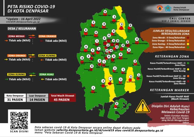 Hal tersebut diungkapkan Juru Bicara Satgas Penanganan Covid-19 Kota Denpasar, I Dewa Gede Rai. “Sudah 40 desa/kelurahan yang zona hijau. Hanya tiga yang masih zona kuning,” kata Dewa Rai saat diwawancarai Minggu (17/4) di Denpasar.