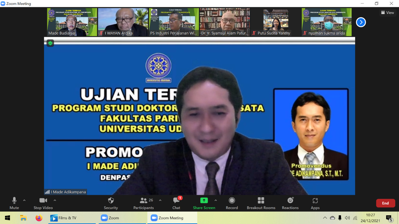 Fakultas Pariwisata Universitas Udayana kembali melahirkan seorang doktor pariwisata pada Sidang Terbuka Promosi Doktor untuk promovendus I Made Adikampana, S.T., M.T., Jumat (24/12). Promovendus merupakan sebutan untuk sarjana yang menyusun disertasi dan mempertahankannya untuk memperoleh gelar doktor di perguruan tinggi.