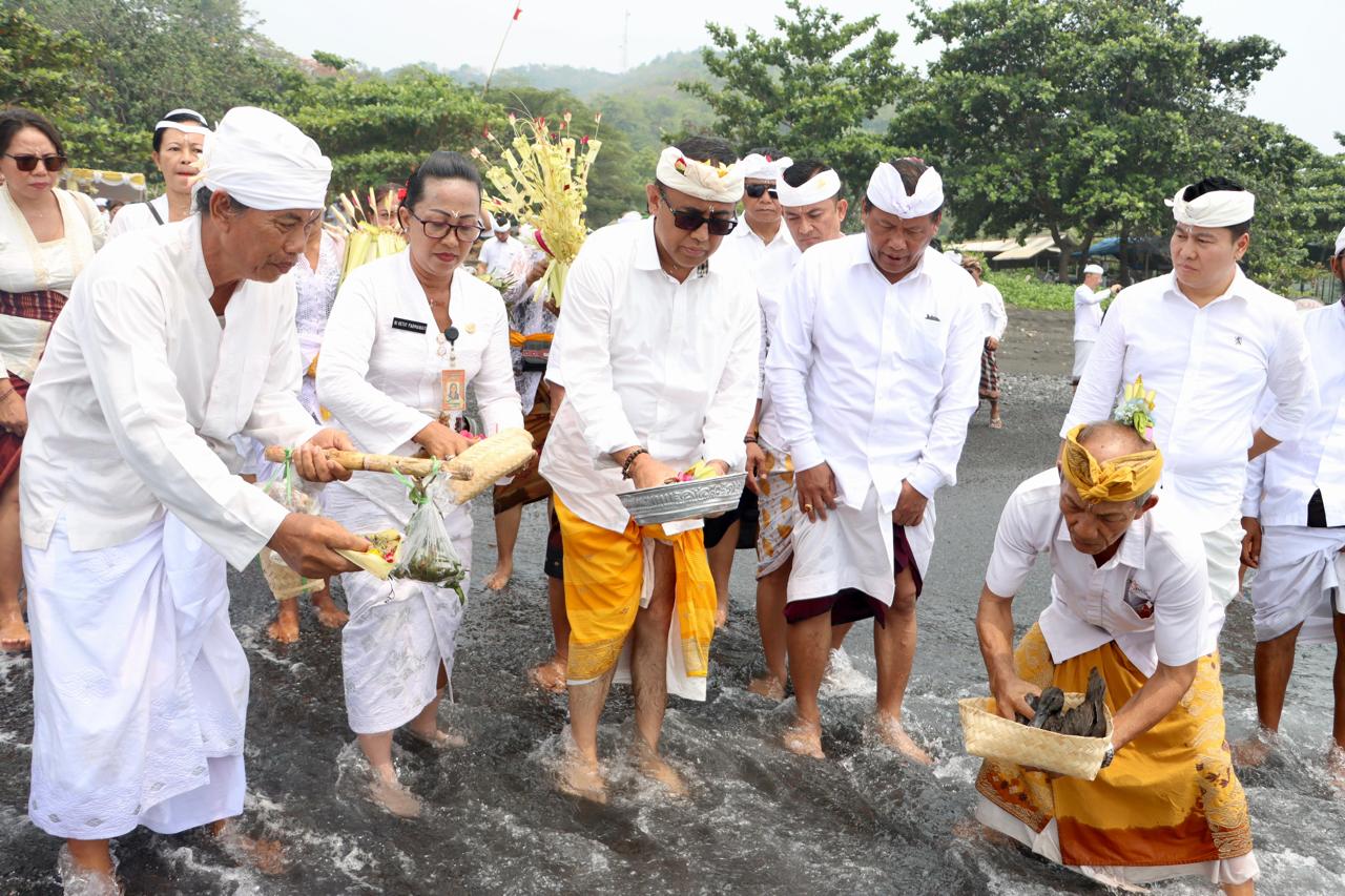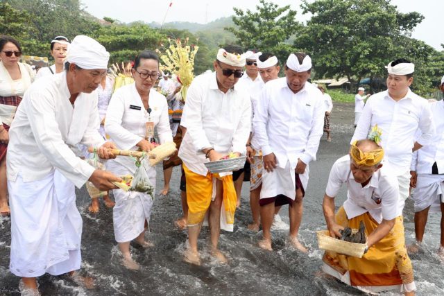 NYEGARA GUNUNG – Walikota Denpasar I Gusti Ngurah Jaya Negara mengikuti prosesi Nyegara Gunung, pada Selasa (26/11) di Pura Goa Lawah, Kabupaten Klungkung.