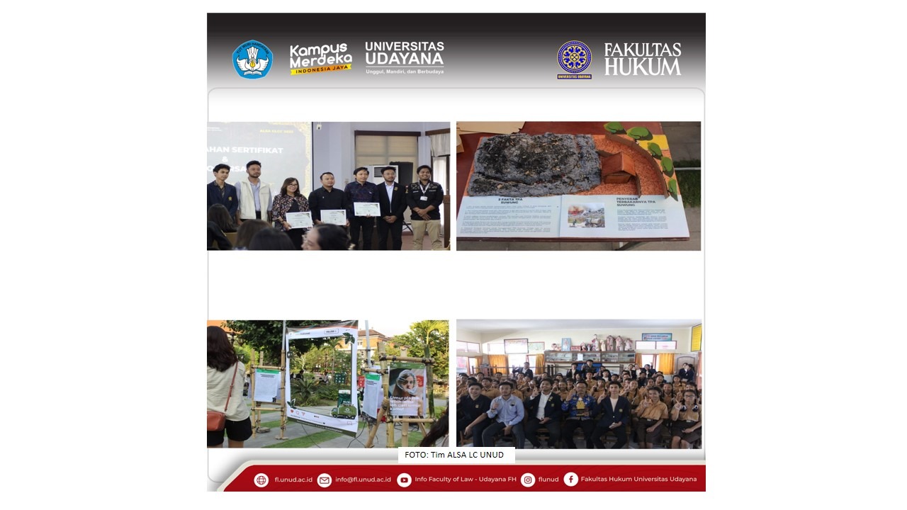 ALSA Local Chapter Unviersitas Udayana (ALSA LC Unud) mengadakan program kerja turunan dari ALSA National Chapter (NC) Indonesia, yaitu “ALSA Care and Legal Coaching Clinic (CLCC) 2023” yang dilaksanakan oleh seluruh ALSA LC di Indonesia. Tema besar yang diangkat oleh ALSA NC Indonesia adalah “Trash-Free Tomorrow: A Path to a Sustainable Waste Management” yang didasarkan pada masalah lingkungan, yaitu sampah dan manajemen limbah yang masih kurang efektif. Tema besar ALSA LC Unud pada tahun ini adalah “Brings Harmony to Sustainability” yang diangkat dari filosofi Tri Hita Karana khususnya Palemahan.