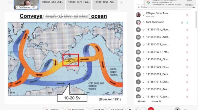 Mahasiswa Fakultas Kelautan dan Perikanan (FKP) Universitas Udayana pada Kamis (24/2) mendapatkan kuliah umum secara online oleh Dr. Fadli Syamsudin dari BPPT BRIN. Topik yang diangkat pada kuliah umum tersebut adalah Kondisi Fisik Benua Maritim Indonesia: Potensi, Bencana, dan Adaptasinya. Kuliah umum ini adalah bagian dari pembelajaran pada mata kuliah Pemodelan Oseanografi. Mahasiswa yang hadir pada kuliah umum tersebut berjumlah 48 orang.