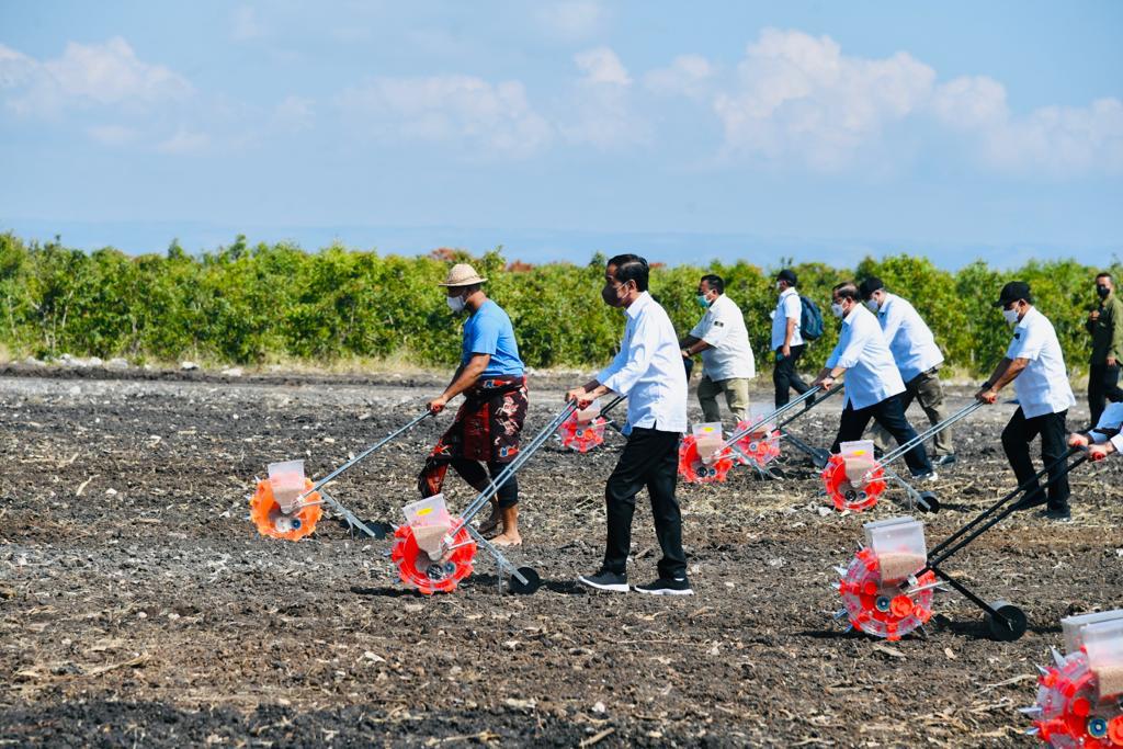 Sebelumnya, Presiden dan Ibu Iriana juga berkesempatan meninjau pengolahan hasil panen sorgum, menanam bibit sorgum dengan menggunakan alat tanam biji benih, dan menyaksikan panen sorgum.