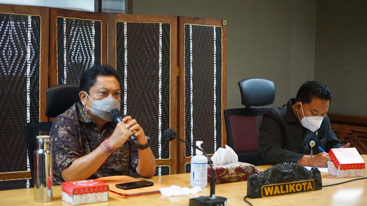 EVALUASI – Walikota Denpasar sekaligus Ketua GTPP Covid-19 Kota Denpasar, IB Rai Dharmawijaya Mantra saat memimpin Rapat Evaluasi Penanganan Covid-19 Kota Denpasar di Graha Sewaka Dharma Kota Denpasar pada Rabu (18/11).