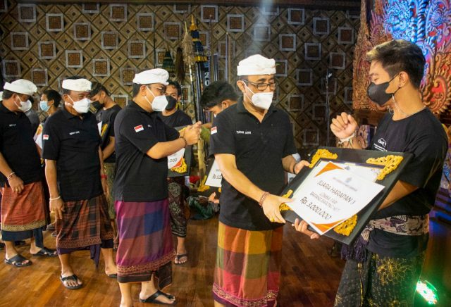 HADIAH – Walikota Denpasar, I Gusti Ngurah Jaya Negara menyerahkan hadiah sekaligus menutup Lomba Bapang Barong Ket dan Mekendang Tunggal Kota Denpasar tahun 2021 di Dharma Negara Alaya Kota Denpasar, Kamis (18/11) malam.