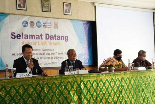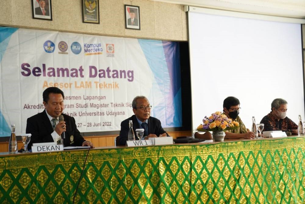 Pada Senin, 27 Juni 2022 dilaksanakan pembukaan Asesmen Lapangan Akreditasi Program Studi Magister Teknik Sipil Fakuktas Teknik Universitas Udayana bertempat di Fakuktas Teknik Kampus Sudirman, Denpasar. Asesmen Lapangan ini dibuka secara resmi oleh Wakil Rektor Bidang Akademik Prof. Dr. Ir. I Gede Rai Maya Temaja, M.P. yang didampingi oleh Dekan Fakultas Teknik Ir. I Ketut Sudarsana, ST, Ph.D. Adapun dua asesor yang hadir dalam asesmen lapangan ini yaitu Prof. Ir. Yoyong Arfiadi, M.Sc., Ph.D dari Universitas Atma Jaya Yogyakarta dan Dr. Eng. Ir. Syafi’i, MT dari Universitas Sebelas Maret.
