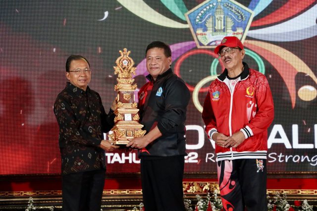 JUARA UMUM II – Sekda Kota Denpasar IB Alit Wiradana mewakili Walikota menerima piala sebagai Juara Umum II Porprov Bali XV tahun 2022.