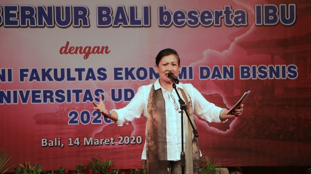RAMAH-TAMAH – Ny. Putri Koster saat melakukan ramah-tamah dengan IKAFEB Unud, Sabtu (14/3) lalu. Saat itu, Putri Koster membacakan puisi Sumpah Kumbakarta yang dinilai sangat relevan dengan situasi saat ini.