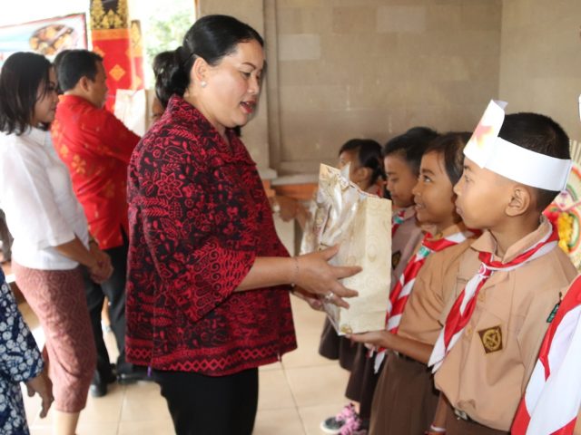 BINGKISAN – Ketua TP PKK Badung Ny. Seniasih Giri Prasta menyerahkan bingkisan kepada murid-murid SD saat Kegiatan Gerakan  Gemar Makan Ikan di Wantilan Puspem Badung, Jumat (23/8).