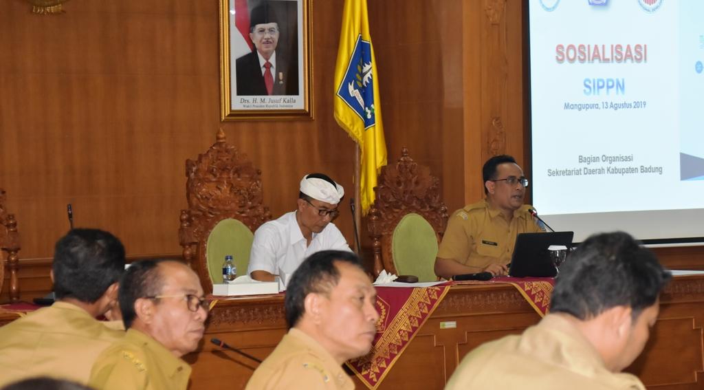 Pemerintah Kabupaten Badung melalui Bagian Organisasi Setda Badung menggelar sosialisasi penyusunan peta proses bisnis intansi pemerintah melalui PermenPANRB No. 19 Tahun 2018 dan Sistem Informasi Pelayanan Publik Nasional (SIPPN). Acara ini dibuka Kabag Organisasi Setda Badung, I Wayan Wijana didampingi Kasubag. Tata Laksana dan Pelayanan Publik, Putu Agus Aribrata, Selasa (13/8) di ruang Kriya Gosana, Pusat Pemerintahan Kabupaten Badung, Mangupraja Mandala. Kegiatan ini diikuti perwakilan Perangkat Daerah di Kabupaten Badung.