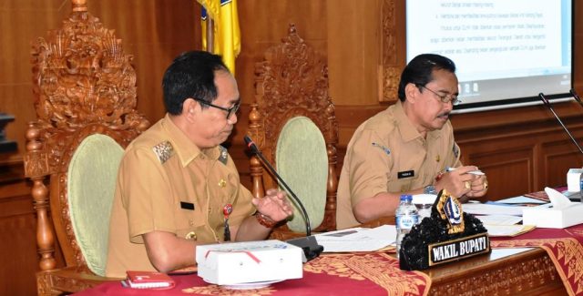 GERTAK – Wakil Bupati Badung I Ketut Suiasa didampingi Asisten Pemerintahan dan Kesra IB Agung Yoga Segara saat memimpin rapat Gerakan Serentak Badung Bersih, Selasa (6/8) di Puspem Badung.