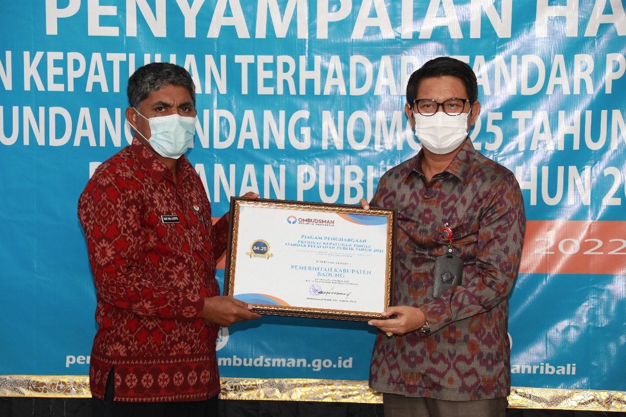 Sekretaris Daerah Kabupaten Badung I Wayan Adi Arnawa mewakili Pemerintah Kabupaten Badung menerima langsung sertifikat kepatuhan tinggi serangkaian acara Penyampaian Hasil Penilaian Kepatuhan Standar Pelayanan Publik sesuai Undang-undang No. 25 Tahun 2019 tentang Pelayanan Publik di tahun 2021 bertempat di Kantor Ombudsman RI Perwakilan Bali, Selasa (11/1). Sertifikat yang diserahkan langsung Kepala Ombudsman RI Perwakilan Bali Umar Ibnu Alkhatab ini turut dihadiri Kabag Organisasi Badung I Wayan Putra Yadnya, Kabag Prokompin Badung Made Suardita serta pejabat terkait di lingkungan Pemkab Badung.