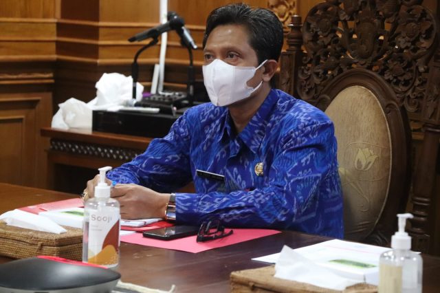 KOMODITI EKSPOR – Asisten II Ida Bagus Gede Arjana mengikuti pembahasan potensi komoditi ekspor pertanian sebagai bahan audiensi dengan Menteri Pertanian melalui virtual zoom meeting di Puspem Badung, Selasa (27/7).