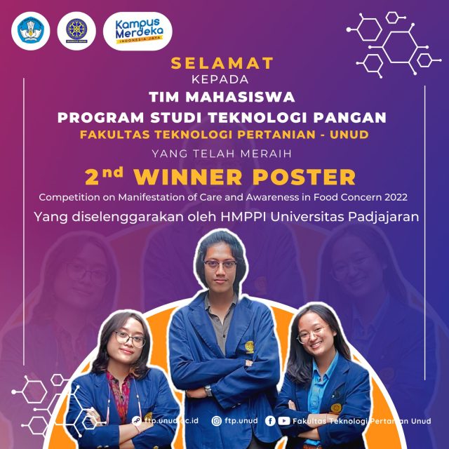 Tim Mahasiswa Program Studi Teknologi Pangan Fakultas Teknologi Pertanian Universitas Udayana yang terdiri atas Gede Agung Artha Deva Jayadhi Narayana, Ermiati, dan Ni Kadek Alit Wirastuti yang Mahasiswa Teknologi Pangan angkatan 2021 mampu mengalahkan pesaingnya dari seluruh Indonesia dan telah meraih 2nd Winner Poster Competition on Manifestation of Care and Awareness in Food Concern 2022 yang diselenggarakan oleh HMPPI Universitas Padjajaran.