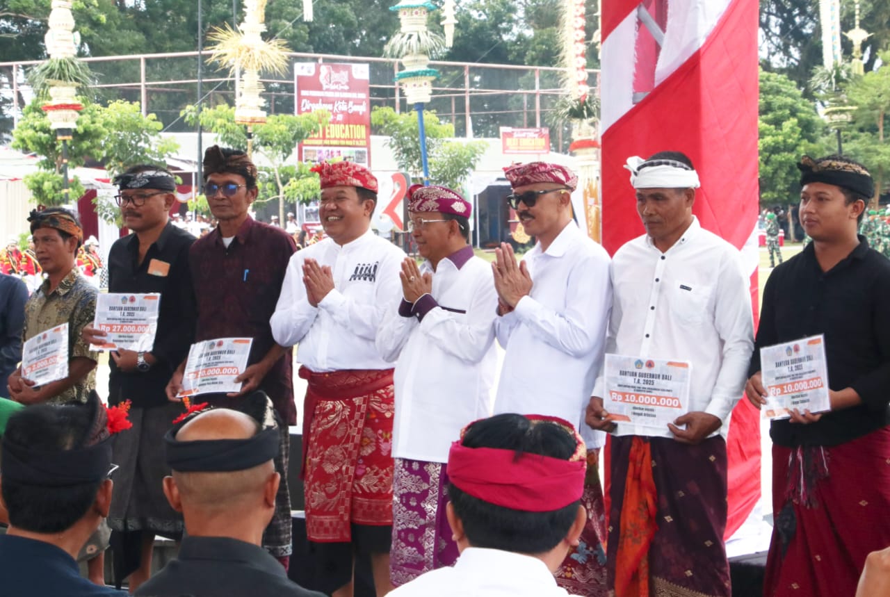Selanjutnya, Gubernur Bali didampingi Bupati Bangli Sang Nyoman Sedana Arta secara langsung menyerahkan bantuan secara simbolis kepada para penerima dari berbagai latar belakang, mulai dari rumah warga, tempat ibadah, fasilitas umum, hingga sarana perekonomian. Kehadiran mereka di tengah acara menjadi bukti nyata bahwa semangat gotong royong masih hidup di tengah masyarakat Bali.