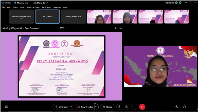IVSA Class pada tahun ini dilaksanakan selama satu hari, yakni Minggu, 12 November 2023, secara daring melalui Cisco Webex Meeting. Wakil Dekan III Fakultas Kedokteran Hewan Universitas Udayana, drh. I Wayan Sudira, M.Si. saat membuka acara meminta peserta untuk menyimak secara bersama IVSA Class agar mengenal lebih dalam mengenai IVSA yang tentu saja akan sangat berguna bagi para peserta mahasiswa FKH Unud, dikarenakan sebagai dokter hewan sangat membutuhkan dokter hewan dan melalui kegiatan-kegiatan yang diadakan oleh IVSA dapat menambah relasi.