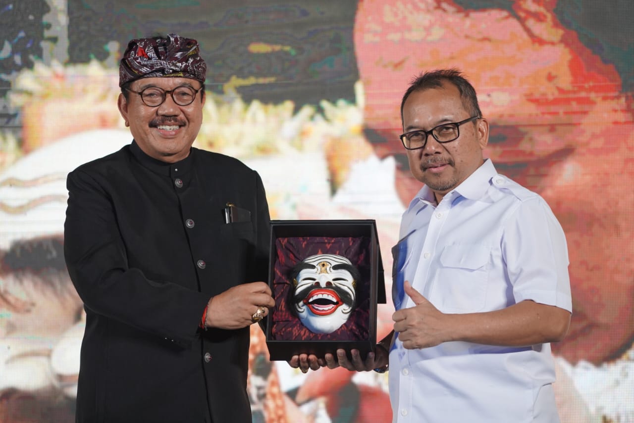 TOPENG SIDAKARYA – Wagub Cok Ace menyerahkan kenang-kenangan berupa topeng Sidakarya kepada Kepala KPw BI Provinsi Bali Trisno Nugroho.