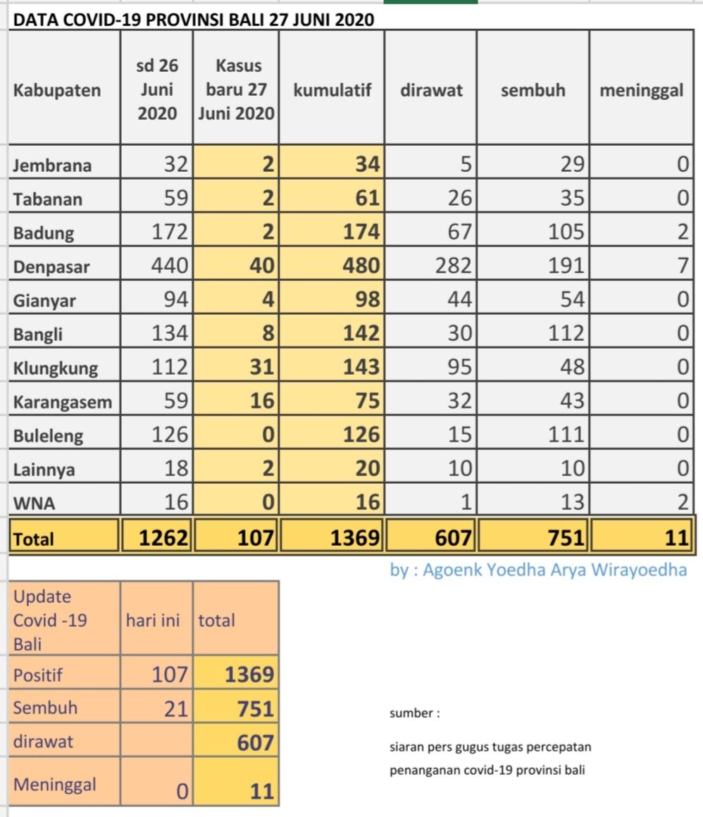 Secara kumulatif, Sabtu (27/6), jumlah pasien covid-19 di Bali mencapai 1.369 orang setelah ada tambahan 107 warga negara Indonesia (WNI). Hal tersebut diungkapkan Ketua Harian Gugus Tugas Percepatan Penanganan Covid-19 Provinsi Bali Dewa Made Indra.