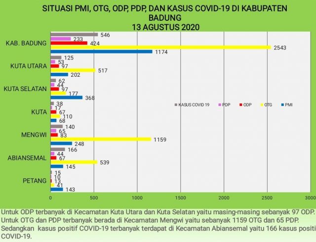 Pada Kamis (14/8/2020), ada penambahan 3 kasus positif sehingga total kasus positif covid-19 di Badung kini menjadi 546 orang (115 PDP, 24 ODP, 391 OTG, 16 PMI). Hal ini dikatakan Koordinator Kehumasan Gugus Tugas Percepatan Penanganan Covid-19 Badung GN Jaya Saputra.