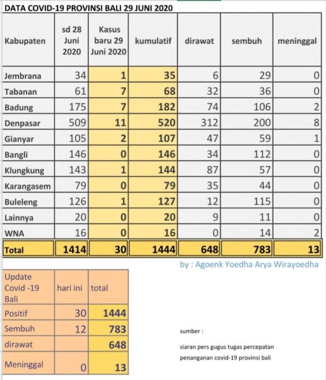 Secara kumulatif, Senin (29/6), jumlah pasien covid-19 di Bali mencapai 1.444 orang setelah ada tambahan 30 kasus positif baru dari warga negara Indonesia (WNI). Hal tersebut diungkapkan Ketua Harian Gugus Tugas Percepatan Penanganan Covid-19 Provinsi Bali Dewa Made Indra.