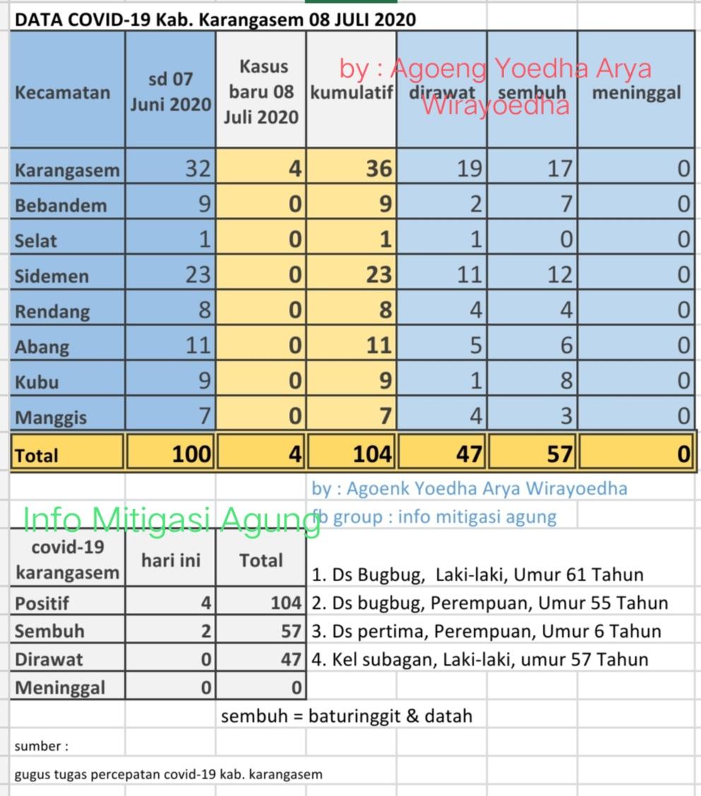 Secara kumulatif, Rabu (8/7), jumlah pasien covid-19 di Karangasem mencapai 104 orang setelah ada tambahan 4 kasus positif baru. Hal tersebut terungkap dari data Gugus Tugas Percepatan Covid-19 Kabupaten Karangasem.