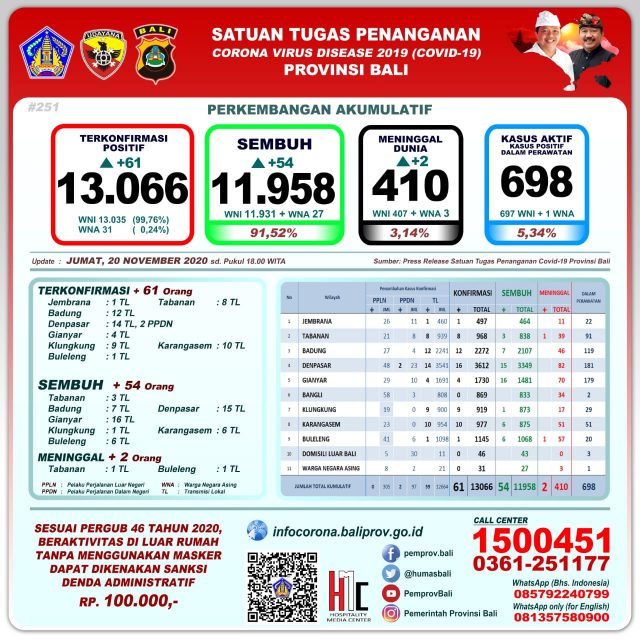 Perkembangan pandemi covid-19 di Provinsi Bali per Jumat (20/11/2020) mencatat pertambahan kasus terkonfirmasi 61 orang (59 orang melalui transmisi lokal dan 2 PPDN). Sembuh 54 orang, dan 2 orang meninggal dunia.