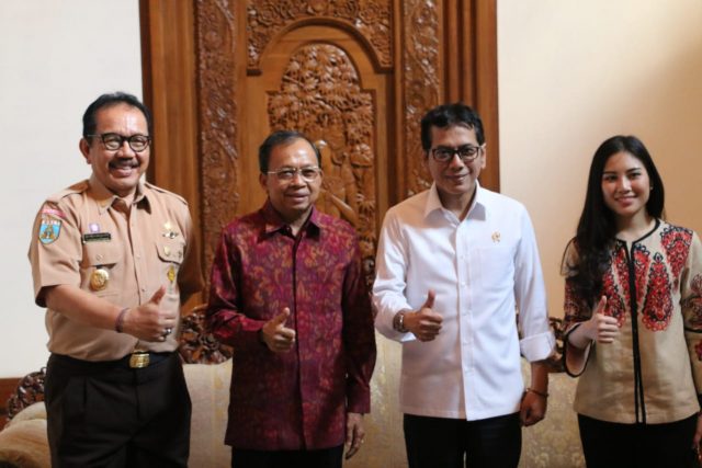 MENPAREKRAF – Gubernur Koster didampingi Wagub Cok Ace saat menerima Menparekraf Wishnutama bersama Wakilnya Angela Tanoesoedibjo.