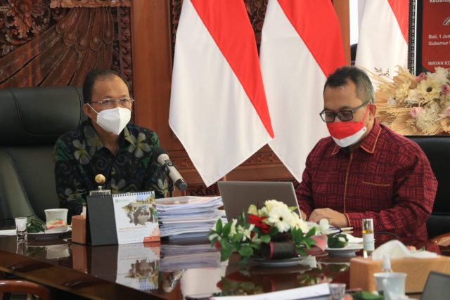 RAKORNAS – Gubernur Bali Wayan Koster bersama Kepala Kantor Perwakilan BI Provinsi Bali Trisno Nugroho mengikuti rakornas pengendalian inflasi 2021 yang dibuka Presiden Joko Widodo, Rabu (25/8/2021).