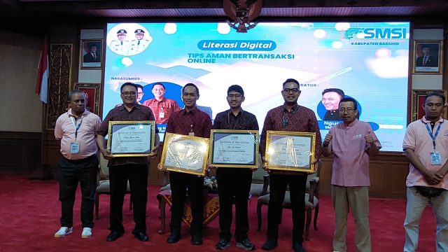 TERIMA PIAGAM – Perwakilan BI Provinsi Bali, Zetra Les Saputra (tengah) menerima piagam penghargaan usai menjadi narasumber dalam Literasi Digital yang digelar SMSI Badung Selasa (21/4/2026), di Kertha Gosana Puspem Badung.