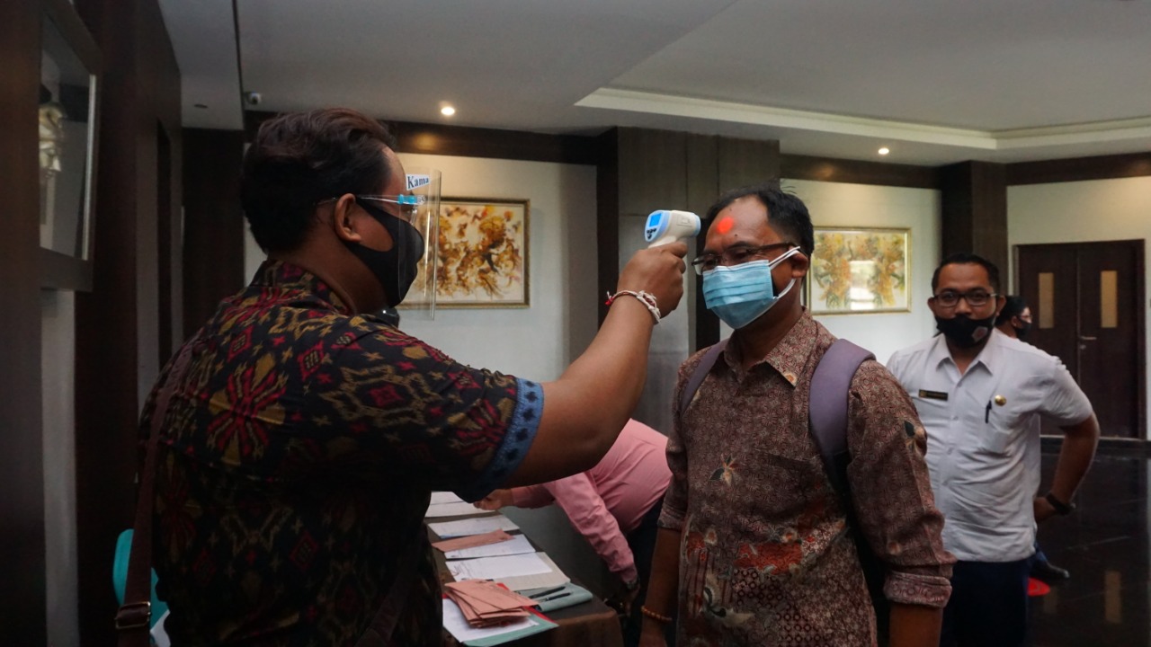 DISIPLIN – Protokol kesehatan dilakukan secara disiplin bagi peserta bimtek DPHP yang digelar KPU Badung, Kamis (6/8).