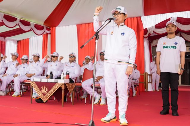 KONTINGEN PORPROV – Bupati Wayan Adi Arnawa mengukuhkan serta melepas kontingen Kabupaten Badung dalam rangka PORPROV Bali XVI Tahun 2025 di lapangan Puspem Badung, Jumat (15/8).