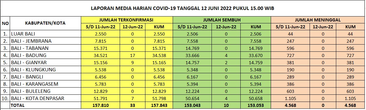 Kasus baru covid-19 di Bali pada Minggu (12/6/2022) bertambah 33 orang, sementara kasus sembuh bertambah 10 orang. Kasus meninggal nihil. Data ini diperoleh dari Satgas Penanganan Covid-19 Bali melalui Humas Pemprov Bali.