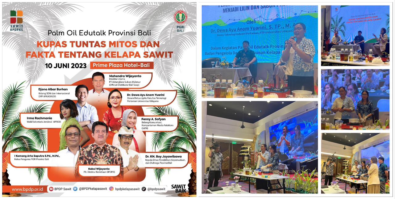 Kegiatan Palm Oil Edu Talk Provinsi Bali 2023 dilaksanakan sebagai wadah penyampaian fakta-fakta objektif tentang kelapa sawit dan mengupas tuntas mitos dan fakta tentang kelapa sawit. Kegiatan ini dihadiri oleh Plt. Direktur Kemitraan BPDPKS yaitu Kabul Wijayanto dan beberapa pembicara lainnya. Dr. Dewa Ayu Anom Yuarini, STP, M.Agb. memberikan pelatihan terkait dengan “Pemanfaatan dan Demo Produksi Lilin & Sabun dari Minyak Jelantah Sawit” yang dimulai dari edukasi kepada peserta terkait cara menggunakan minyak goreng yang baik, pemurnian minyak jelantah sawit dan pengolahan minyak jelantah sawit menjadi produk non-pangan yang memiliki nilai jual yang tinggi serta demo dan praktik secara langsung dalam proses pemurnian minyak jelantah sawit dan pengolahan minyak jelantah sawit menjadi produk sabun dan lilin.