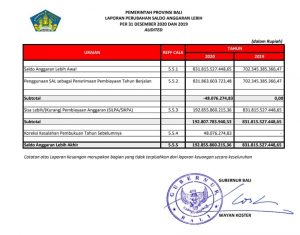 Menurut opini BPK, laporan keuangan yang disebut di atas, menyajikan secara wajar, dalam semua hal yang material, posisi keuangan Pemerintah Provinsi Bali tanggal 31 Desember 2020, dan realisasi anggaran, perubahan saldo anggaran lebih, operasional, arus kas, serta perubahan ekuitas untuk tahun yang berakhir pada tanggal tersebut, sesuai dengan Standar Akuntansi Pemerintahan.