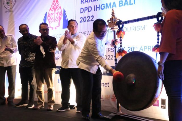 IHGMA – Wagub Cok. Ace membuka Rakerda IHGMA Bali dengan pemukulan gong, Rabu (20/4/2022).