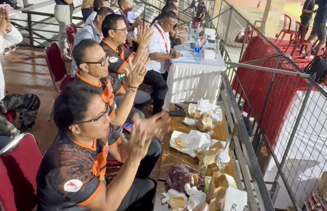 SAKSIKAN PERSEDEN – Wagub Bali Nyoman Giri Prasta bersama Wali Kota I Gusti Ngurah Jaya Negara dan Wawali Kadek Agus Arya Wibawa menyaksikan langsung perjuangan Perseden Denpasar di Stadion Ngurah Rai, Denpasar, Jumat (2/5) malam.
