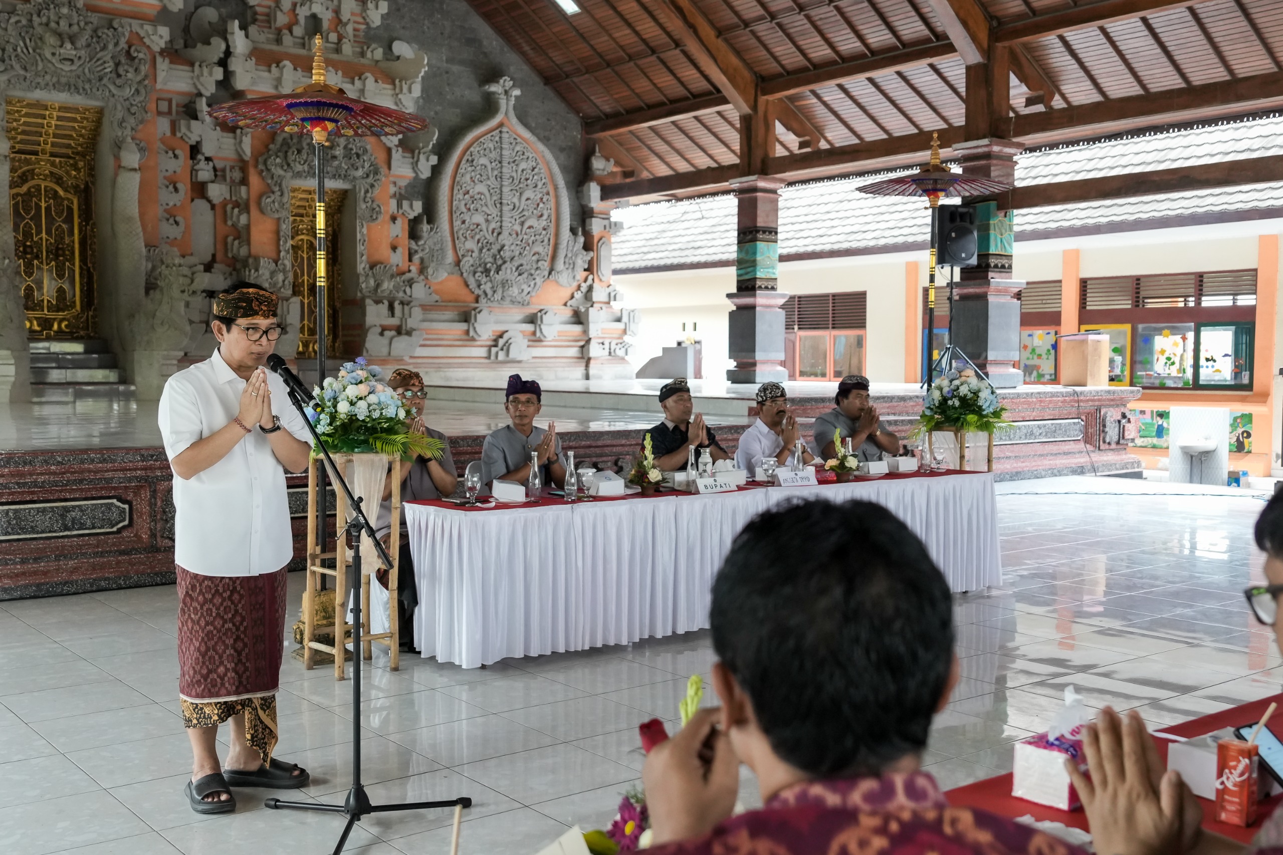 RAPAT PLENO – Bupati Wayan Adi Arnawa saat menghadiri Rapat Pleno Pekaseh dan Kelian Subak Abian se-Badung yang dilaksanakan di Wantilan Jaba Pura Dalem Sedang, Abiansemal, Selasa (19/8).