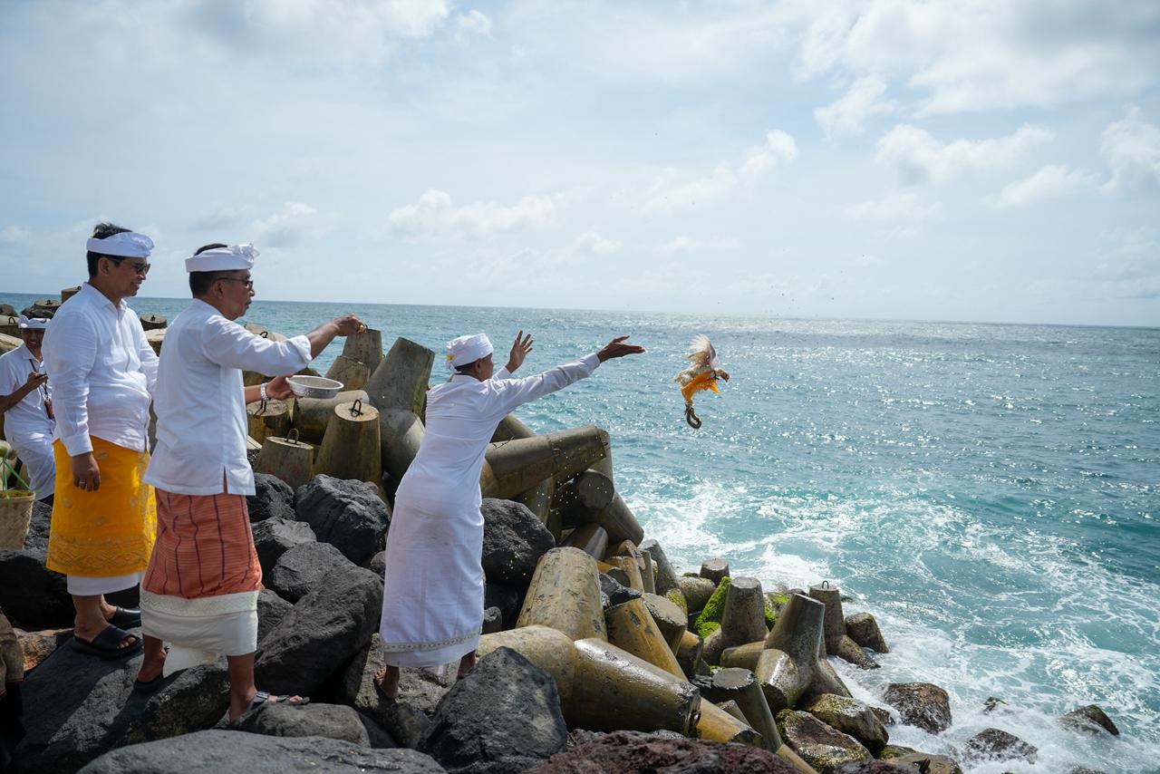 MULANG PEKELEM – Bupati Wayan Adi Arnawa sembahyang bersama dan mulang pekelem saat Pujawali Pedudusan Alit di Pura Luhur Uluwatu, Desa Pecatu, Kecamatan Kuta Selatan, Selasa (9/12).