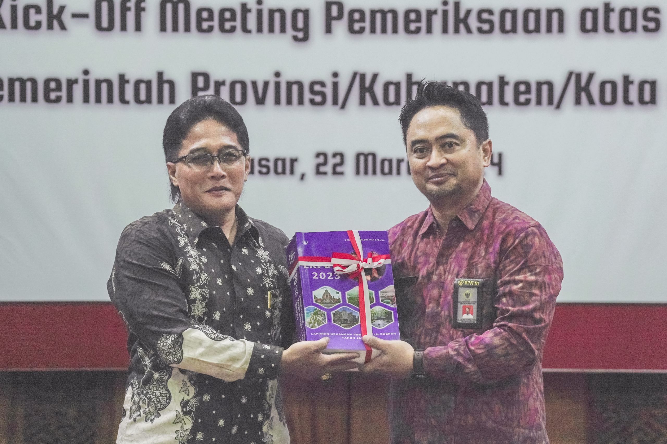 Bupati Badung I Nyoman Giri Prasta menyerahkan Laporan Keuangan Pemerintah Daerah (LKPD) Unaudited (laporan yang belum diaudit) Tahun 2023 kepada Kepala Badan Pemeriksa Keuangan (BPK) RI Perwakilan Provinsi Bali I Gusti Ngurah Satria Perwira, dalam acara Penyerahan LKPD Unaudited tahun 2023 oleh seluruh pemerintah di Provinsi Bali dan Kick-Off Meeting Pemeriksaan atas LKPD tahun 2023 pada Pemerintah Provinsi/Kabupaten/Kota se-Bali, di Kantor BPK RI Perwakilan Bali, Renon, Jumat (22/3). Pada kesempatan tersebut Bupati Giri Prasta melakukan penandatanganan berita acara serah terima dan menerima surat tugas pemeriksaan atas LKPD 2023 dari Kepala BPK RI Perwakilan Bali.