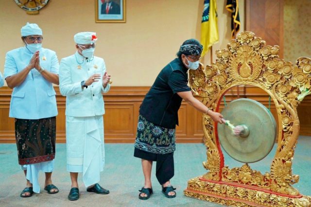PUKUL GONG – Bupati Badung Nyoman Giri Prasta memukul gong pertanda dimulainya Lokasabha I Maha Gotra Tirta Harum Kabupaten Badung, Sabtu (15/1) di Puspem Badung.
