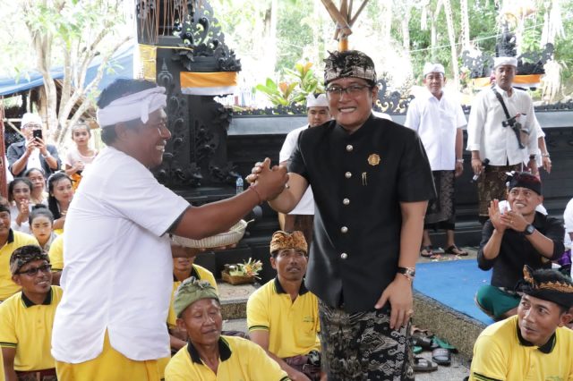 NGENTEG LINGGIH – Bupati Nyoman Giri Prasta menghadiri Karya Agung Ngenteg Linggih di Pura Paibon Jineng Pasek Gelgel Banjar Adat Ambengan Linggah, Desa Adat Sebunibus, Desa Sakti Kecamatan Nusa Penida, Klungkung, Jumat (7/10).