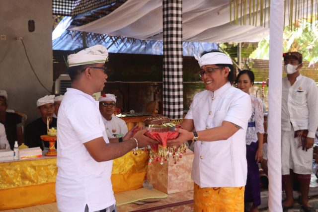 TAPAKAN – Bupati Giri Prasta disaat menghadiri karya Ngeratep, Melaspas dan Pasupati Tapakan Ida Bhatara Ratu Ngurah Sakti, Ratu Istri dan Ratu Ayu di Pura Dalem Meranggi Desa Adat Sibang Kaja, Kecamatan Abiansemal, Jumat (17/12).