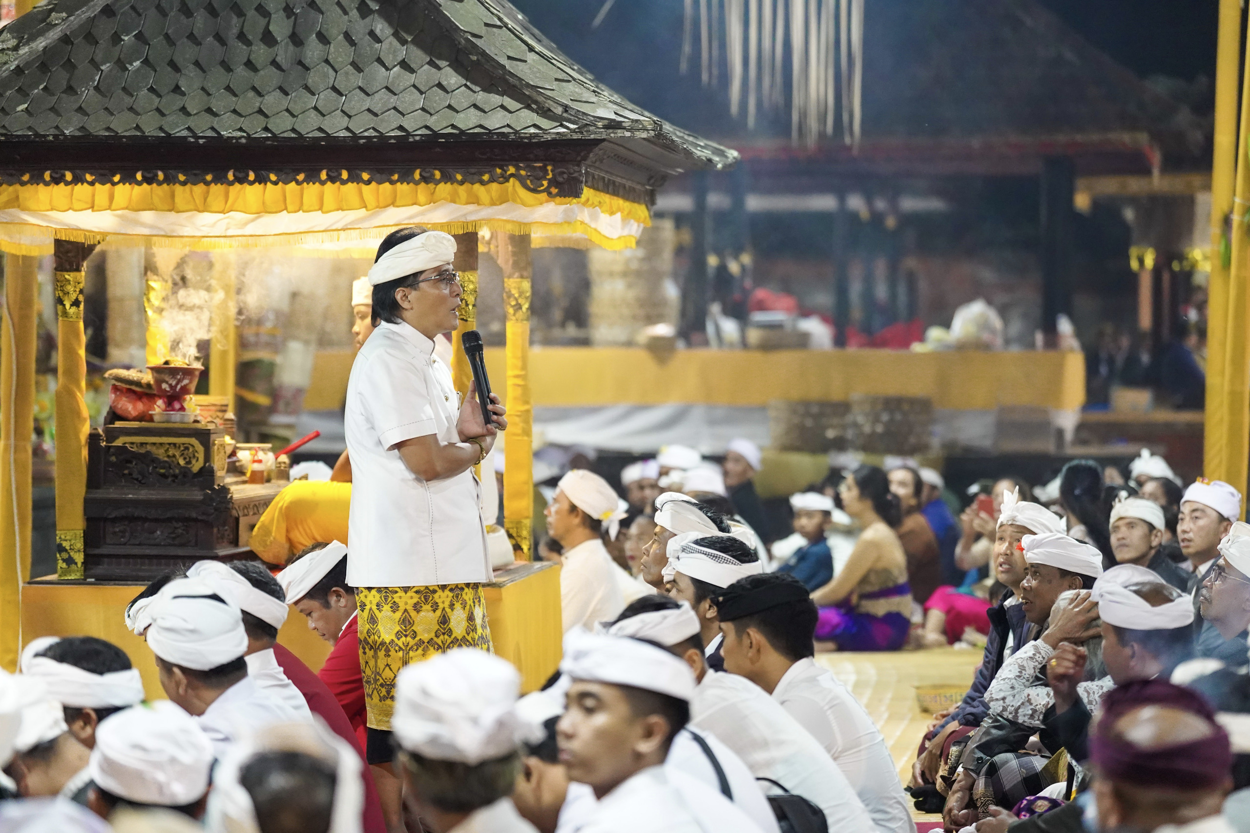 Bupati Badung I Nyoman Giri Prasta mengucapkan rasa syukur kepada Ida Sang Hyang Widhi Wasa dan Ida Betara yang berstana di Pura Dalem Balingkang agar semua masyarakat diberikan keselamatan dalam melaksanakan pujawali ini. “Kehadiran saya di sini untuk meringankan beban krama semua dan ini murni dari pikiran yang suci dan ning nirmala, apalagi khususnya masyarakat di Desa Adat Pinggan, banyak menghabiskan waktu di adat seperti kelabu baang/orang meninggal, mecaru amanca, ngodalan, ngotonan, potong gigi, upacara manusa yadnya, piodalan di tingkat dadia sampai Sad Kahyangan, itu memerlukan waktu dan uang yang tidak sedikit. Maka dari itu kami hadir di tengah-tengah masyarakat untuk meringankan beban masyarakat seperti saat ini,” ucapnya.