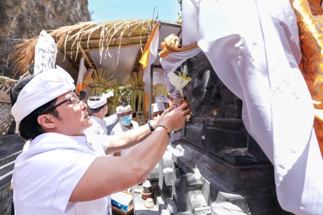 MAMUNGKAH – Bupati Giri Prasta saat menghadiri karya Mamungkah Ngenteg Linggih Padudusan Alit Weraspati Kalpa di Parahyangan LPD Desa Adat Kutuh, Kuta Selatan. Selasa (6/9).