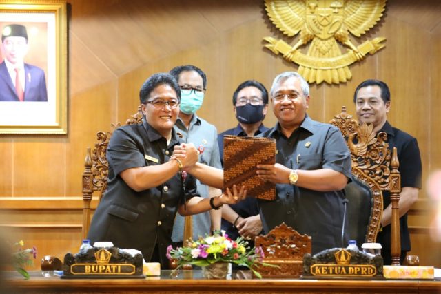 JAWABAN – Bupati Giri Prasta saat menyerahkan jawaban pemerintah kepada Ketua DPRD Badung Putu Parwata dalam Rapat Paripurna DPRD di Puspem Badung, Senin (24/8/2020).