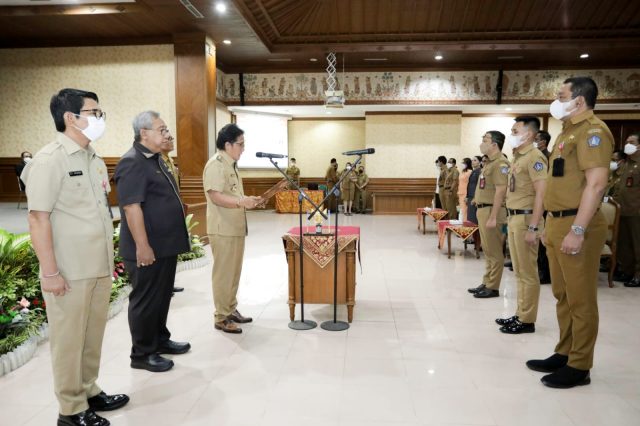 Bupati Badung I Nyoman Giri Prasta memimpin upacara pelantikan dan pengambilan sumpah jabatan terhadap 1 orang Pejabat Pimpinan Tinggi Pratama, 28 orang Pejabat Administrator, 45 orang Pejabat Pengawas dan 31 orang Pejabat Fungsional di lingkungan Pemerintah Kabupaten Badung, Senin (22/8) bertempat di Ruang Kertha Gosana Puspem Badung. Turut hadir Ketua DPRD Kabupaten Badung Putu Parwata, Sekretaris Daerah Kabupaten Badung Wayan Adi Arnawa, Ketua TP PKK Badung Ny. Seniasih Giri Prasta, Wakil Ketua TP PKK Badung Ny. Kristiani Suiasa, Ketua Gatriwara Ny. Ayu Parwata, serta kepala perangkat daerah di lingkup Pemerintah Kabupaten Badung.