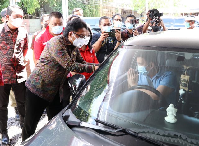 DRIVE THRU – Bupati Giri Prasta bersama Wabup Suiasa saat memantau vaksinasi drive thru bagi pekerja pariwisata bertempat di parkiran Waterbom Kuta, Selasa (20/4).