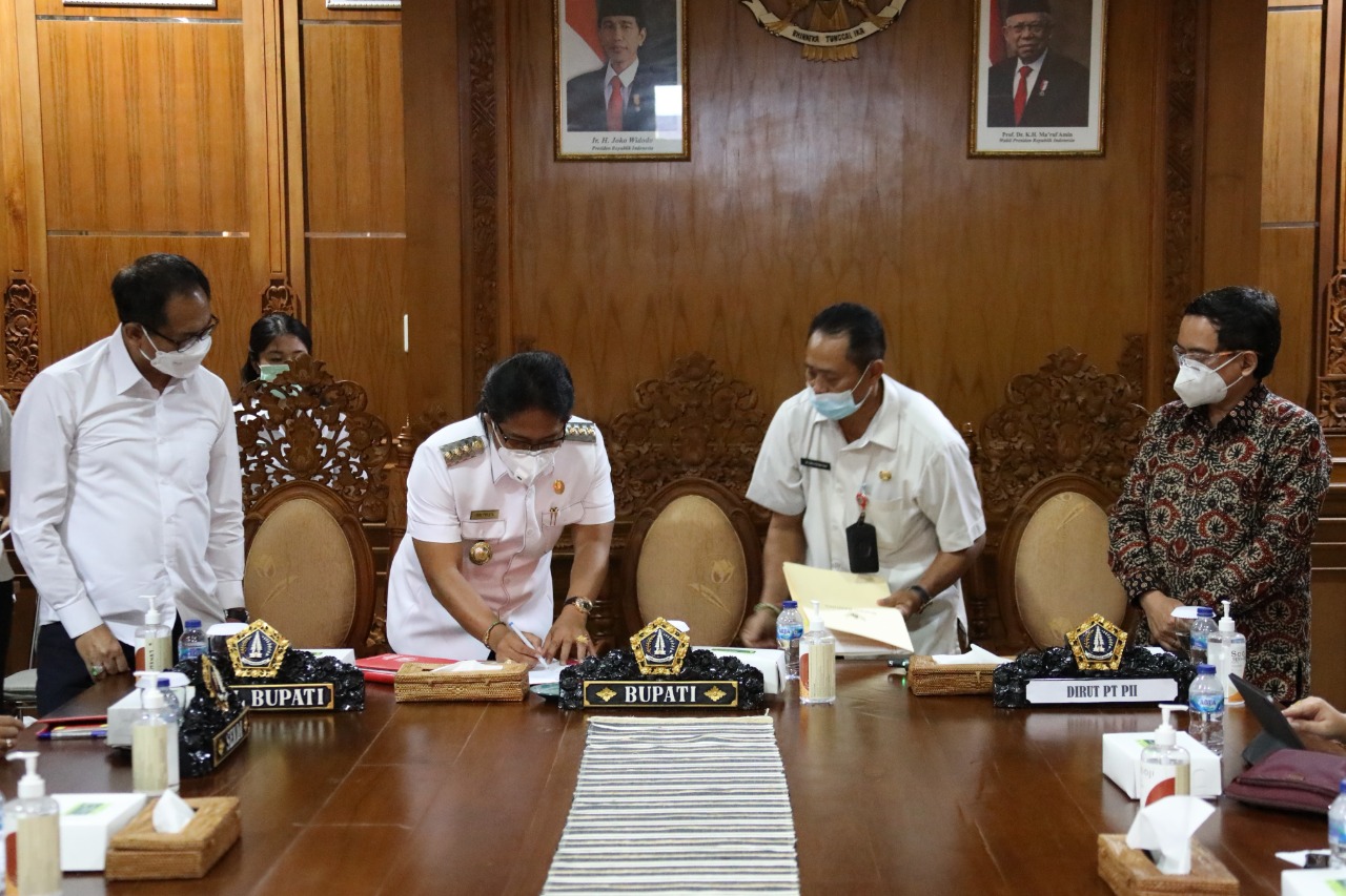 Bupati Badung I Nyoman Giri Prasta menerima dan melakukan penandatangan trase final dengan PT Penjamin Infrastruktur Indonesia (PII) terkait Penjaminan Proyek Kerjasama Pemerintah dengan Badan Usaha (KPBU) Pembangunan Jalan Lingkar Selatan bertempat di Ruang Nayaka Gosana I Puspem Badung, Rabu (10/3).