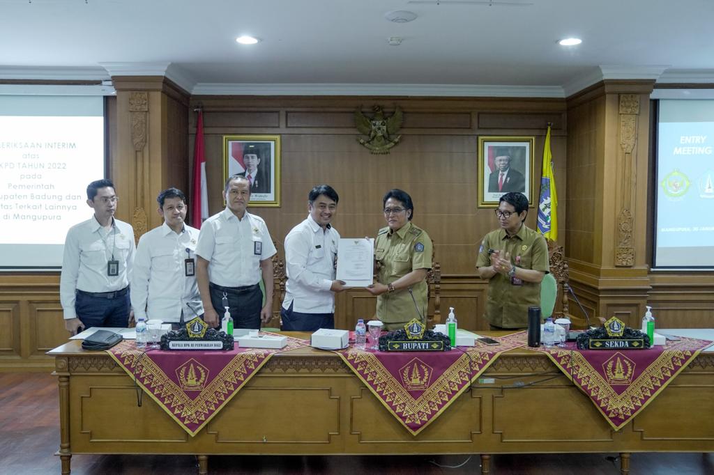 Bupati Badung I Nyoman Giri Prasta didampingi Sekda I Wayan Adi Arnawa menerima entry meeting Badan Pemeriksa Keuangan (BPK) RI Perwakilan Bali di Puspem Badung, Senin (30/1). Entry BPK kali ini terkait dengan pemeriksaan interim atas Laporan Keuangan Pemerintah Daerah (LKPD) tahun 2022 pada Pemerintah Kabupaten Badung dan entitas terkait lainnya. Pada kesempatan tersebut hadir Kepala Perwakilan BPK RI Provinsi Bali yang diwakili Wakil Penanggungjawab Tim Pemeriksa I Gusti Ngurah Satria Perwira bersama anggota Tim BPK serta pimpinan perangkat daerah di lingkungan Pemkab Badung.